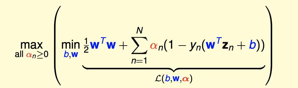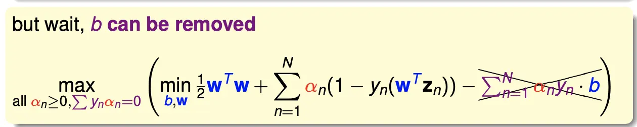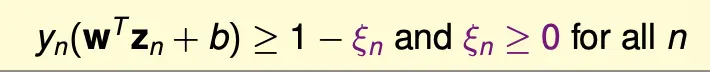 分两种情况,即满足约束条件和不满足约束条件的, 约束条件(y(wx+b) - 1 >= 0),这图里是z代替x,是因为z代表的是特征转换(不是kernel,是feature transform)后的数据