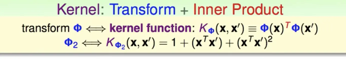 由于对偶SVM经常解决的是non-linear问题,所以就是用 Φ(x)来代替fearture transform后的数据,x->Φ(x),其实是两个步骤,先进行空间转换,再进行内积,现在问题就是我们这个Φ(x)要进行内积,那必然是比原来空间的数据进行内积还要复杂,那该怎么解决呢,我们能不能把这两个步骤联合起来呢。