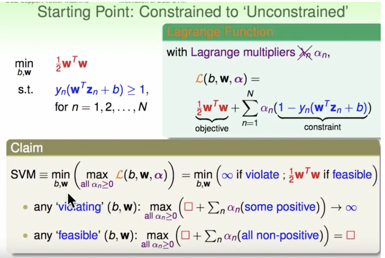 从物理意义上来讲,原来的问题做特殊的自由放缩,对偶问题是找到α>0时是SV,并用其来重建Margin