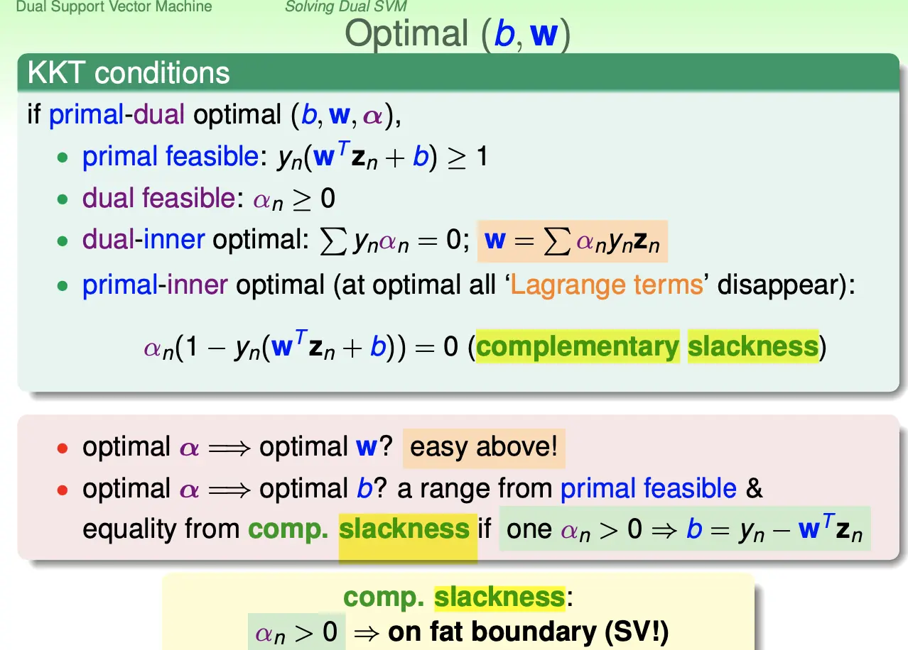 其实上述4个KKT条件中,我们只用到第三个和第四个,第四个称为互补松弛性,怎么来的呢,记得上面推导为什么要min(max拉格朗日函数),就是因为在可行域内,当第四个条件里的公式=0,我们才有最大的拉格朗日函数。由此,根据这个条件,当α>0时,不就有1-y(wx+b) = 0吗,即b = y-wx, 这不就是我们的SV吗,所以我们就可以求得w和b,只需要保留SV,其他点都可以不要。