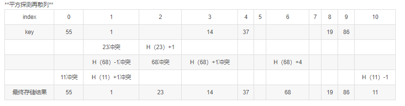 - 平方探测再散列——di=1^2,−1^2,2^2,−2^2 (平方探测表长有限制:表长m必须为4j+3的质数)