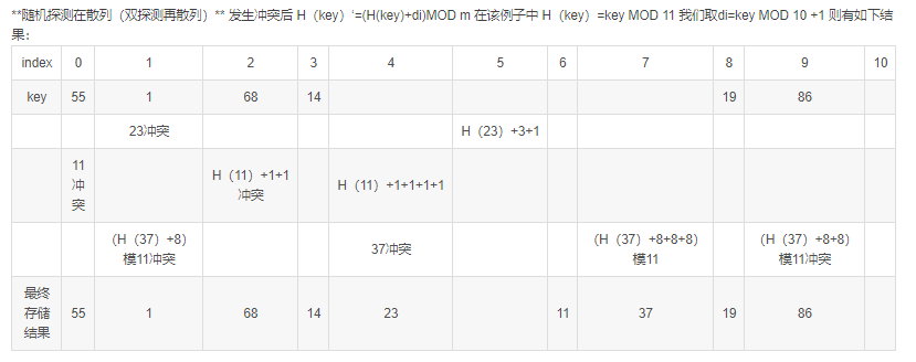- 随机探测在散列(双探测再散列)——di是一组伪随机数列(随机探测di有限制:随机探测时m和di没有公因子)