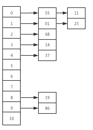 产生hash冲突后在存储数据后面加一个指针,指向后面冲突的数据 上面的例子,用链地址法则是下面这样:
