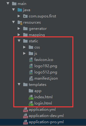 前后端分离开发,为了方便部署,我们把前端静态资源放入resources中,static里面用来存放css,js等,templates存放html页面,如下图所示。