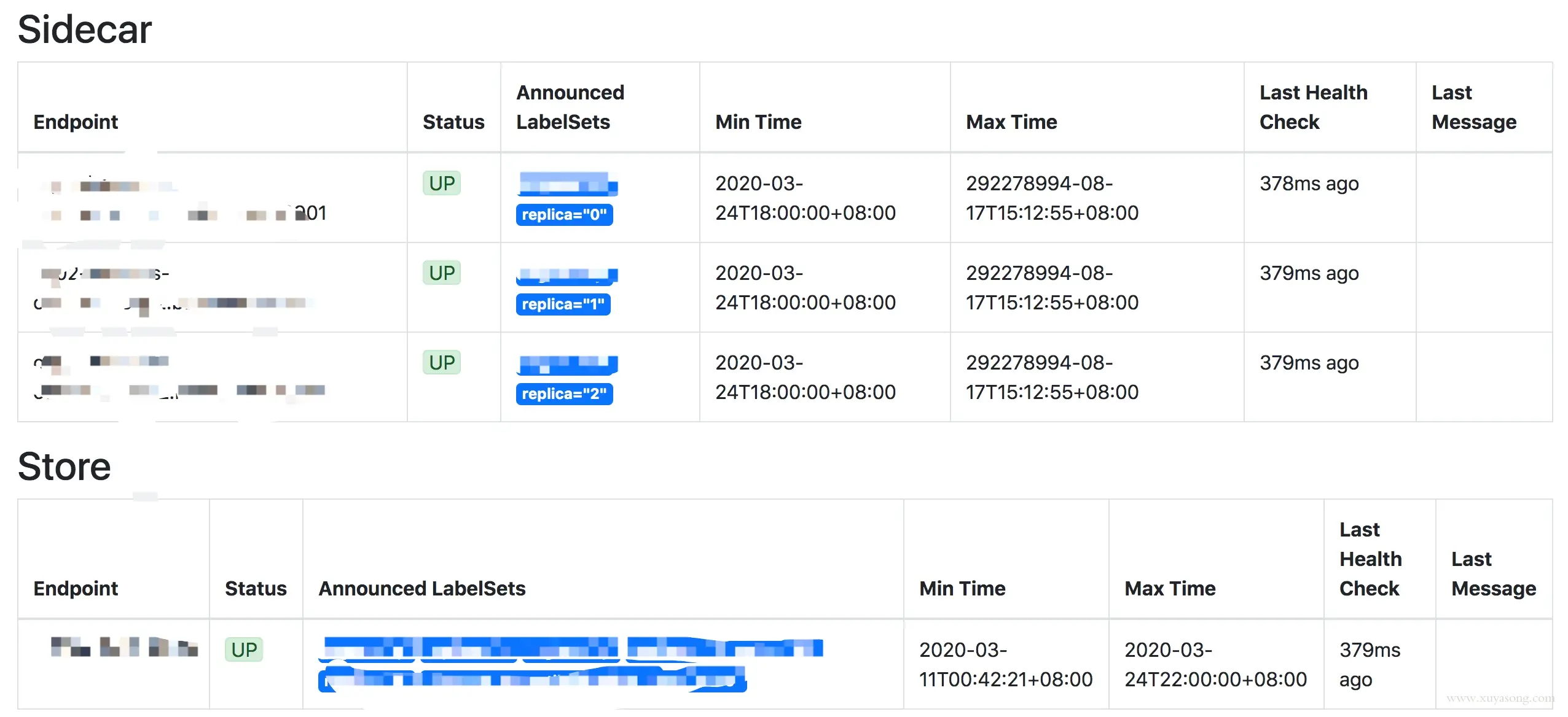 store 参数代表的就是刚刚启动的 sidecar 组件,启动了 3 份,就可以配置三个relica0、relica1、relica2,10901 是 sidecar 的默认端口。