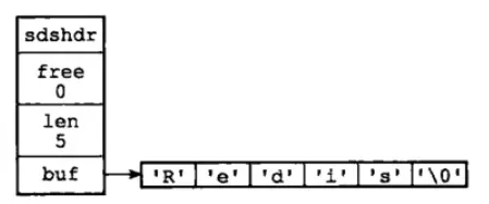 用 SDS 保存字符串 “Redis” 具体结构如下图
