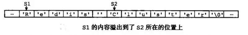 s1 = 'Redis',s2 = 'MongoDB',当执行strcat(s1, " Cluster")时,未给 s1 分配足够内存空间,s1 的数据将溢出到 s2 所在的内存空间,导致 s2 保存的内容被意外地修改。