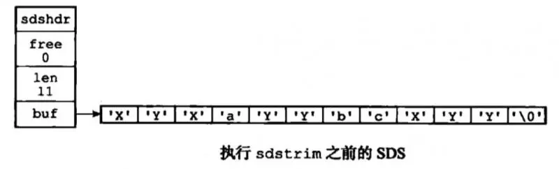 sdstrim(s, "XY"); // 移除 SDS 字符串中的所有 'X' 和 'Y'