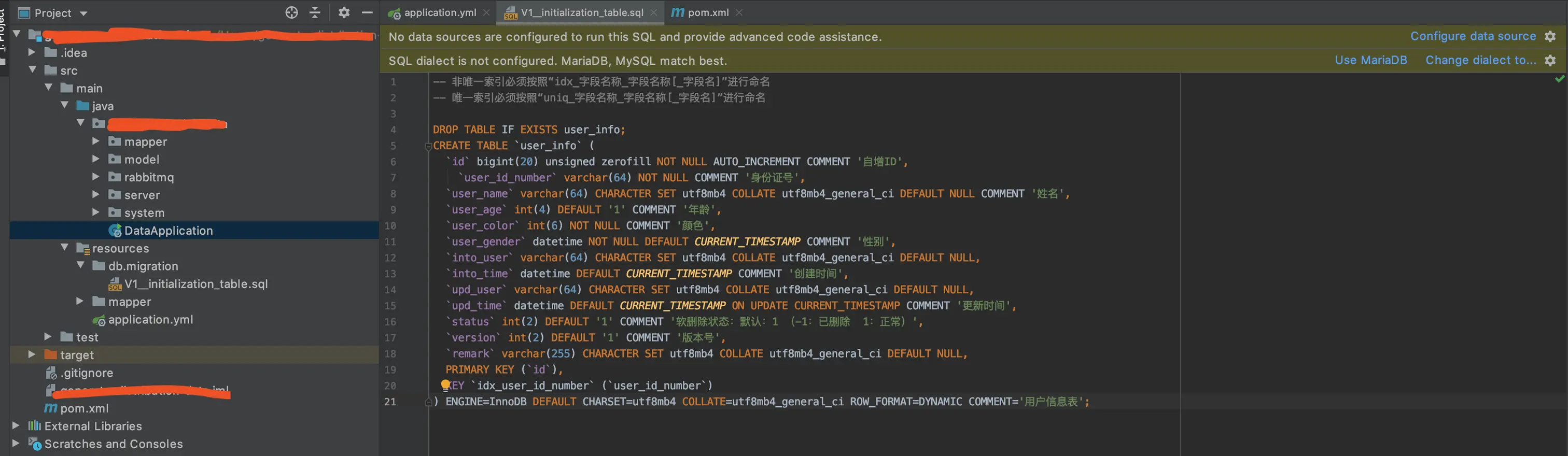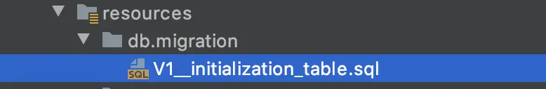 在db.migration包下新建V1__initialization_table.sql文件,命名一定要按flyway的规定来,要不然是无法识别的。