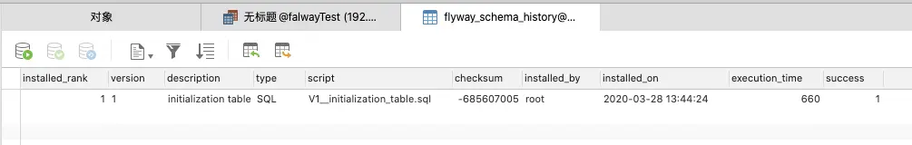 首次使用falway升级的时候,会在数据库新增一个表,名为:flyway_schema_history,如下图: