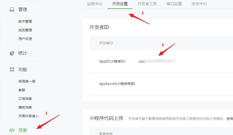 登录 小程序后台 ,我们可以在菜单 “开发”-“开发设置” 中看到小程序的 AppID 了 。