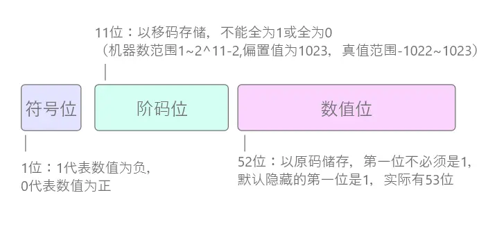 一个占64位的双精度浮点数,不同位表示意义如下:
