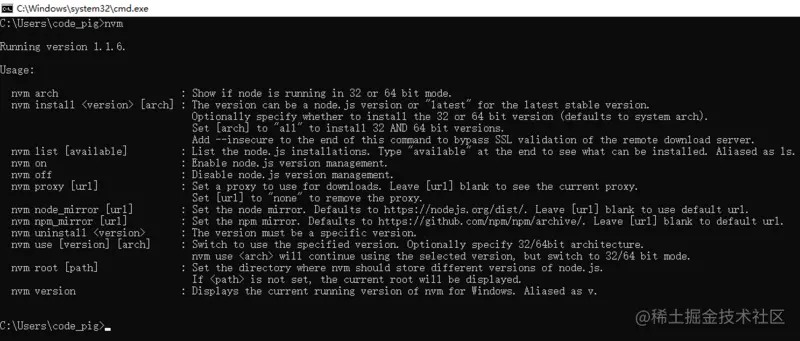 使用window键+ R 运行 cmd 命令,打开控制台窗口,输入nvm