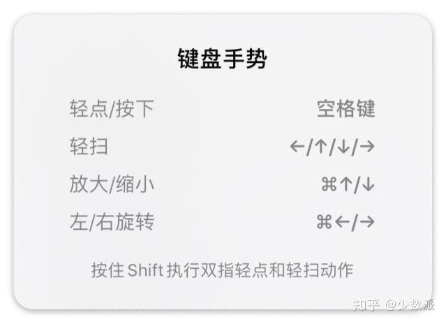 在「键盘手势」模式里,你的方向键也变成了朝四个方向滑动屏幕的手势。而 Command + 方向键则对应着放大缩小以及旋转的操作。如果你想要用双指点按或滑动屏幕,只需要按住 Shift 键,再点击空格或方向键即可。