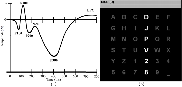 (a)ERP波形示意图 (b)经典P300拼写器范式界面