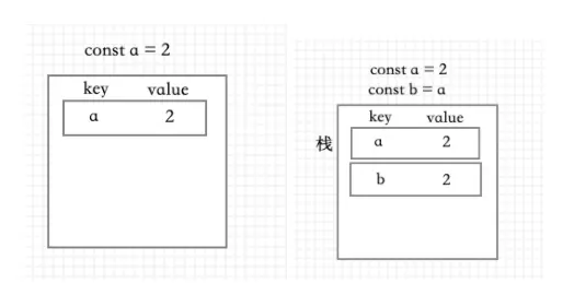 从上面两图中,我们可以看到,当我们执行const b = a的时候,栈内存中开辟了新的内存空间来存储我们的变量b,并将a的值2赋给了b的value。所以我们可以看到a和b已经是两个不同的变量了。他们存储在不同的内存空间中,所以他们之间互不关联,更改其中一个变量的值也不会影响另外一个变量的值。