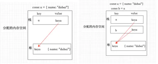 当我们执行const a = { name: "dabai"}的时候,分配的内存空间中的顶部的栈会存储一个key为a, value为keya的变量。其中keya表示堆中变量的地址,从上面左边的图中可以看到,在底部的堆中keya对应的value就是我们要存储的值{name: "dabai"}。而当我们进行赋值操作的时候,就是右边的图,执行const b = a的时候,js引擎会在栈中新开辟一个用来存储变量b的空间,然后将a的value拷贝到b的value属性。所以a和b变量存储的是同一个内存地址keya,指向同一个堆地址keya。而keya的value存储的是{name: "dabai"}。
