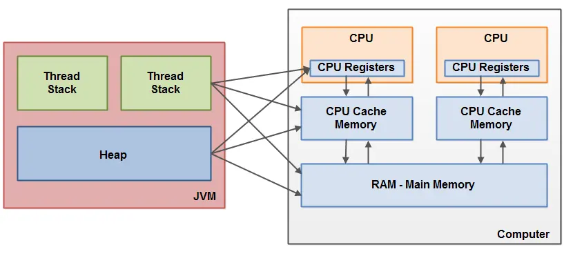 Java 在 JVM 层面,线程都有自己线程栈和内存空间,线程栈中对于变量一般有自己的一份拷贝。但是对于引用变量,虽然也是拷贝,但是变量指向的对象存储在共享的堆中。