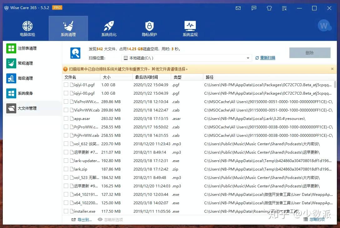 既然是花钱,那么我们当然希望的是花的值,Wise Care 365 的专业版最主要的是加入了一些专业功能模块,比如说对于一些系统中的大文件,看上去非常占用空间,就可以通过其「大文件管理」功能进行分析,告诉你这些大文件能不能删除。