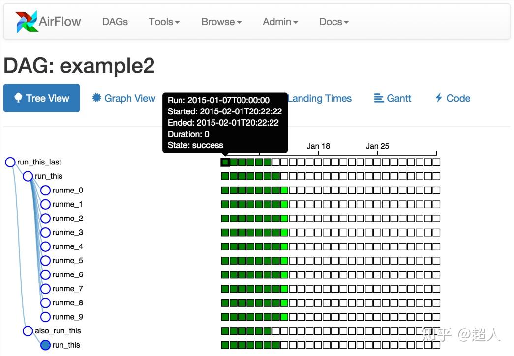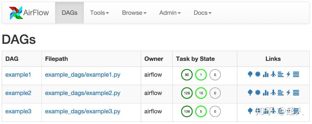 在airflow的主页,可以看到当前所有的DAG列表(通俗点说就是所有的调度任务列表),中间“Task by State”那一列显示任务的执行状态。深绿色的表示已执行成功的task,浅绿色的表示当前正在执行的task。