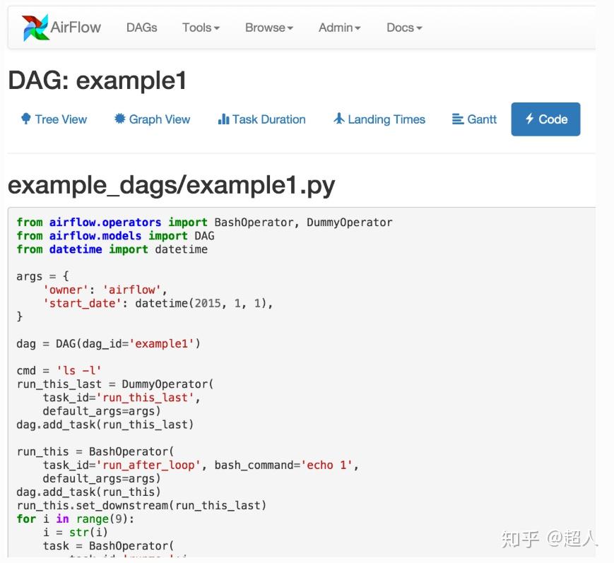 通过“Code”选项,可以查看当前DAG调度的脚本。脚本里面定义了需要执行的task、执行顺序及依赖、调度时间、失败发送邮件或重调机制等方法
