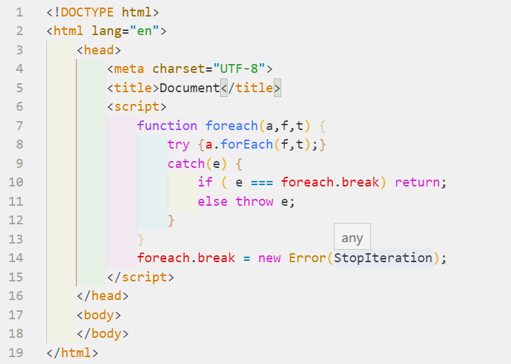 注意: forEach()无法在所有元素都传递给调用的函数之前终止遍历。没有像for循环中使用的相应的break语句,如果要提前终止,必须把forEach()方法放在一个try块中,并抛出一个异常。如: