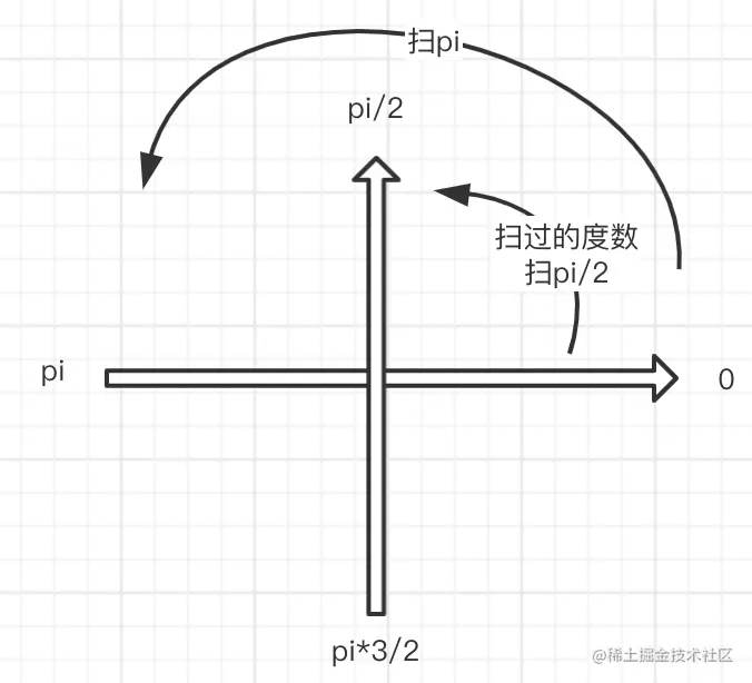 例如demo里面,左面半弧形,就应该是 起始:pi*3/2, 扫半圆也就是:pi,因此我们的代码是: