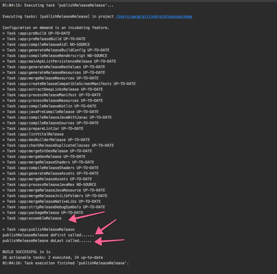 并且我们还在任务里面加入了两个action,一个通过“doFirst”添加,一个通过“doLast”添加。当我们再执行这个任务的时候,发现他先执行了"assembleRelease"这个任务,然后才开始执行我们的“publishReleaseRelease”这个任务,并且先执行的“doFirst”对应的action,人后执行的“doLast”的action。执行结果如下: