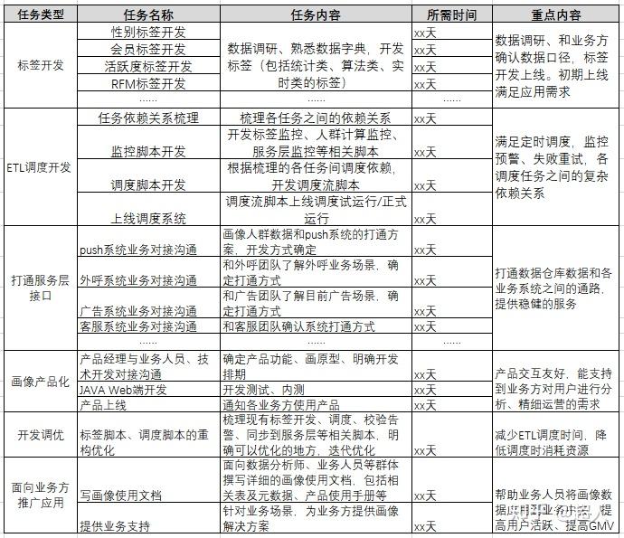 在画像系统的项目规划阶段需要明确好项目的开发上线流程以及项目各个阶段的时间节点、关键产出物和可能遇到的难点。