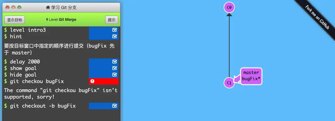 22、learnGitBranching:一个 Git 命令可视化学习项目。能够生动形象的帮助开发人员理解、学习 Git 命令,通过一系列刺激的关卡挑战,逐步深入的学习 Git 的强大功能。在线尝试