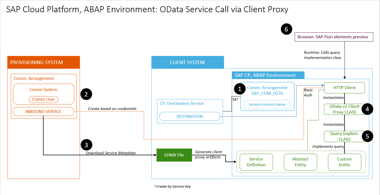 (1) client System创建outbound communication. (2) 在provision系统创建inbound communication. (3) Create a Service Consumption Model, and save this locally as a $metadata XML file; From this you will create proxy artefacts in the client system, representing the remote service, and use this model to generate an abstract entity. (4) 创建一个remote client proxy (5) 在client System创建一个OData服务,使用Fiori Elements消费并展示从provision系统取回的数据