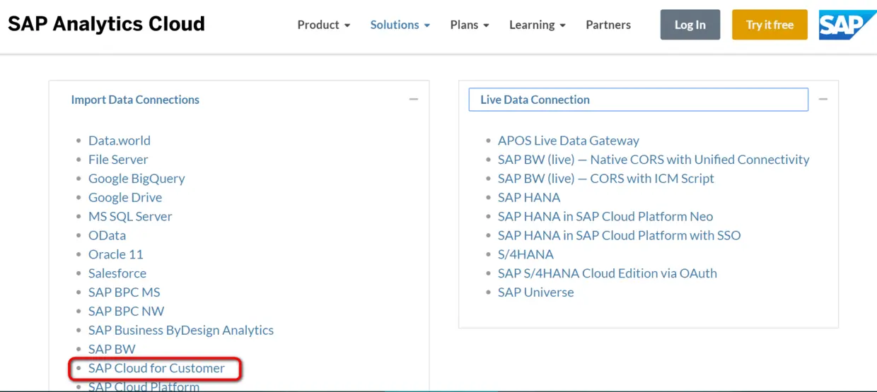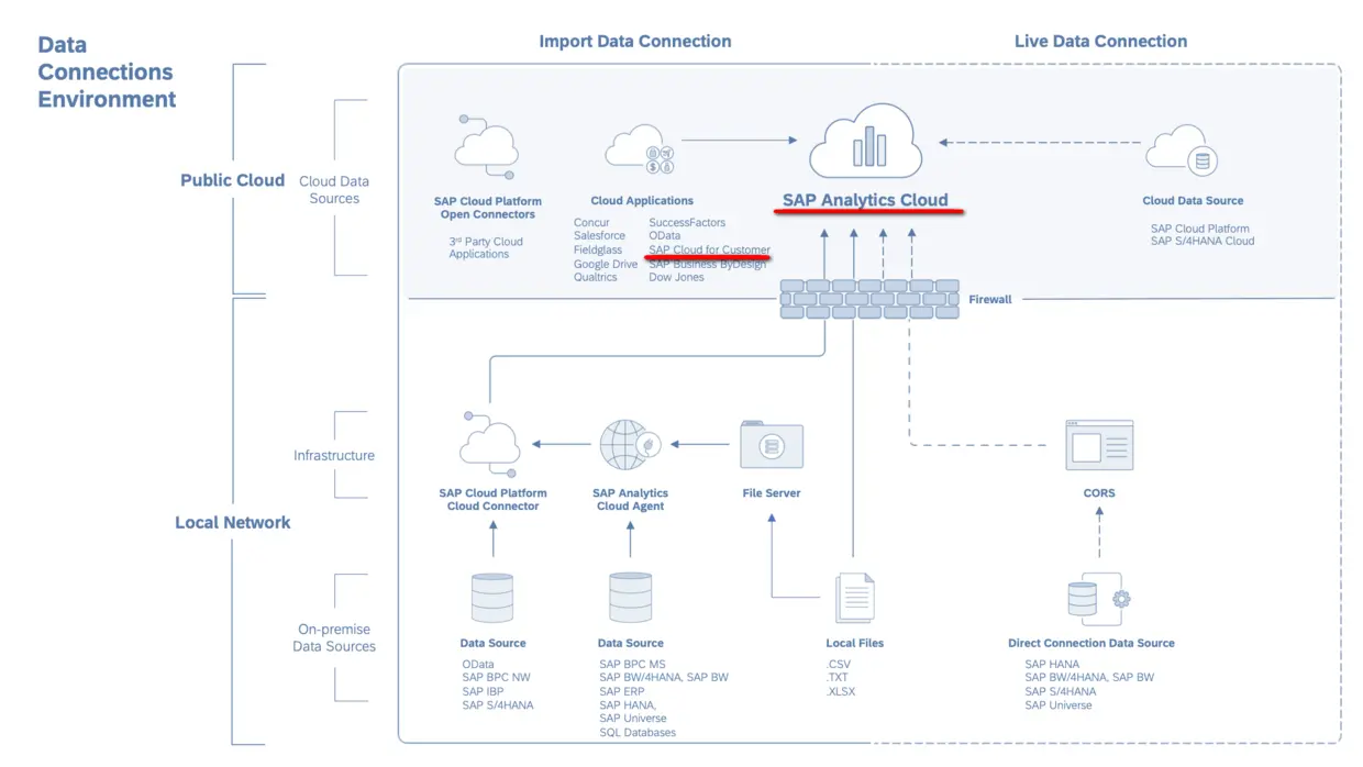 从SAP Analytics Cloud官网得知,Analytics Cloud同提供数据源的SAP其他产品或第三方系统建立连接,有Live Data Connections和Import Data Connections两种,二者最大区别就在于前者没有数据复制(Replication), 而后者存在类似SAP ERP和SAP CRM之间的数据复制。