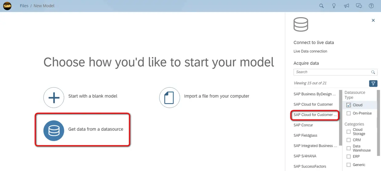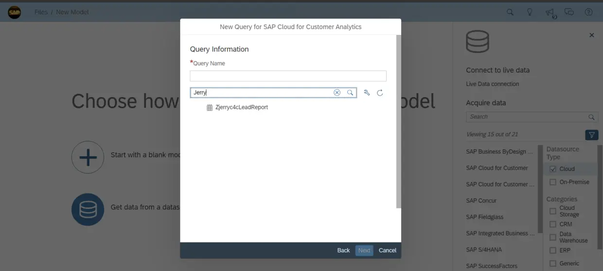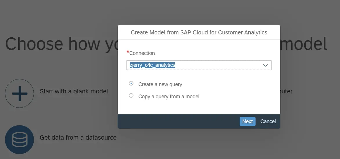 连接建立后,基于该连接开启一个新的Model创建任务,选择SAP Cloud for Customer Analytics: