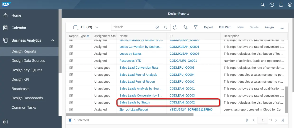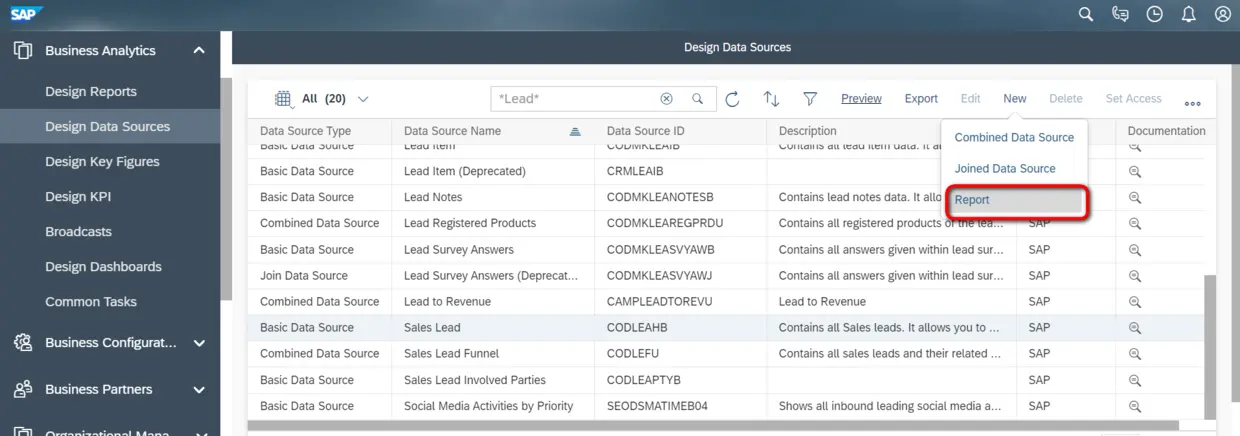 假设SAP C4C发布的标准Report不能满足我项目的实际需求,我可以基于Sales Lead(CODLEAHB)这个C4C的标准Data Source,自己新建一个Report.