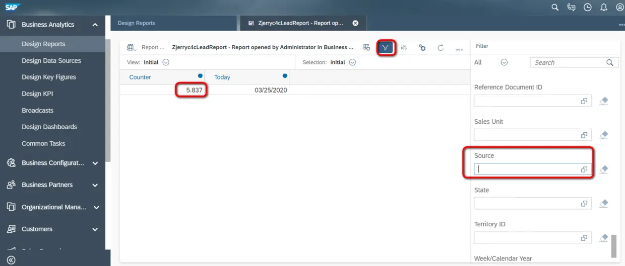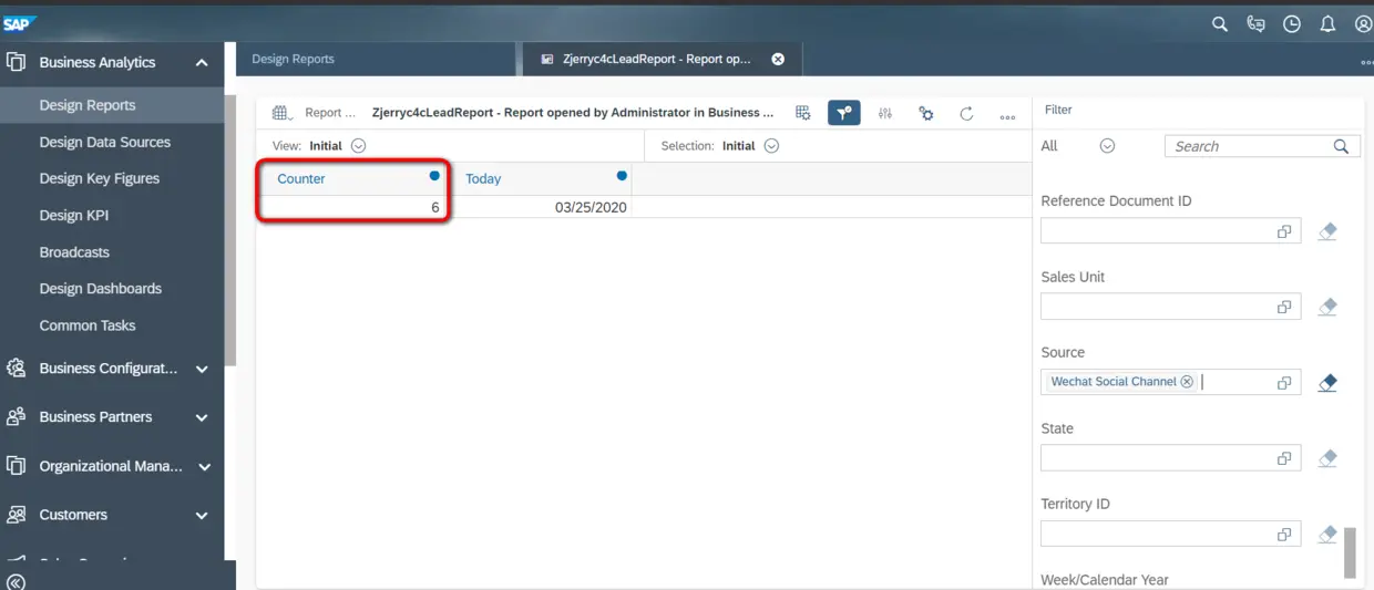 选中默认的两个Key Figure,Counter和Today,因为我希望创建的这个Report,能告诉我:到今天为止,C4C系统里一共存在多少个Lead,以及这些Lead的来源分布情况(通过Lead的Source字段区分)。