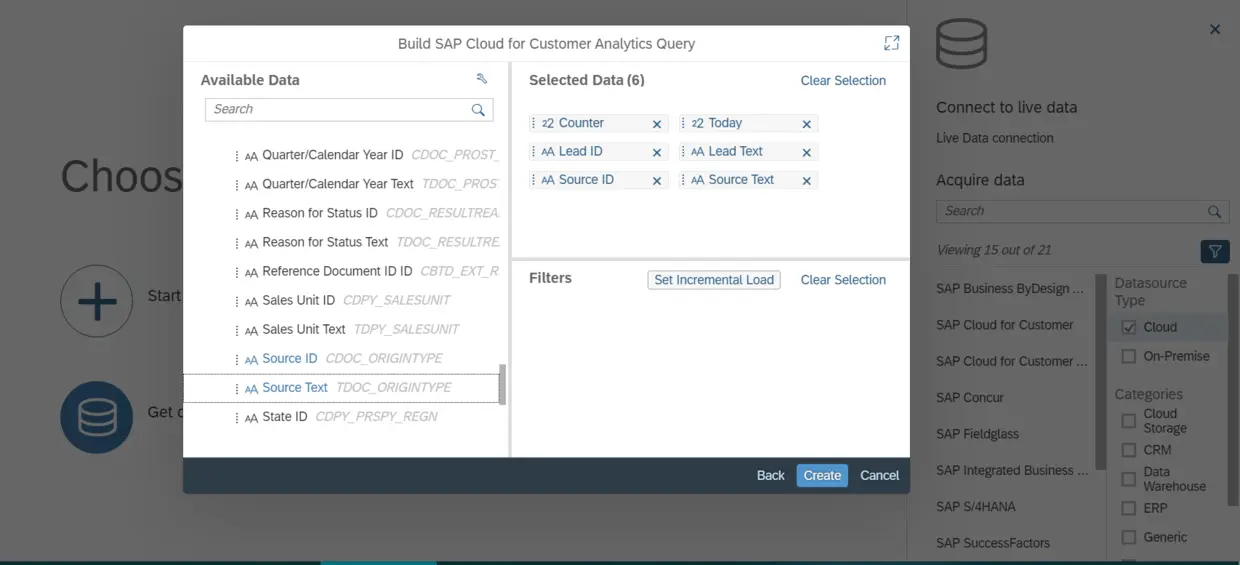 在SAP Analytics Cloud里可以选择C4C 自定义Report里所有支持的Characteristics作为SAP Analytics Cloud模型的选择条件。下图的Incremental Load工作原理和SAP CRM中间件的Delta Download类似,不在本文讨论范围之内。