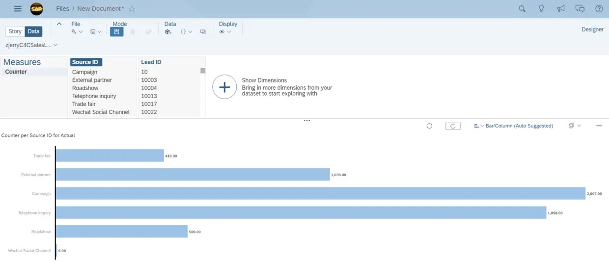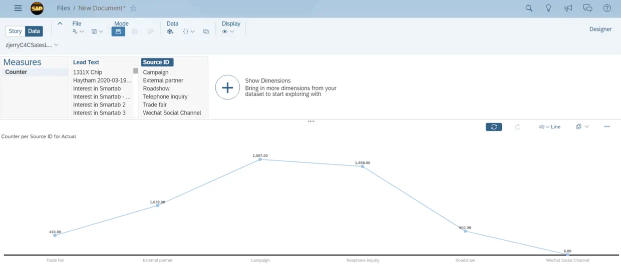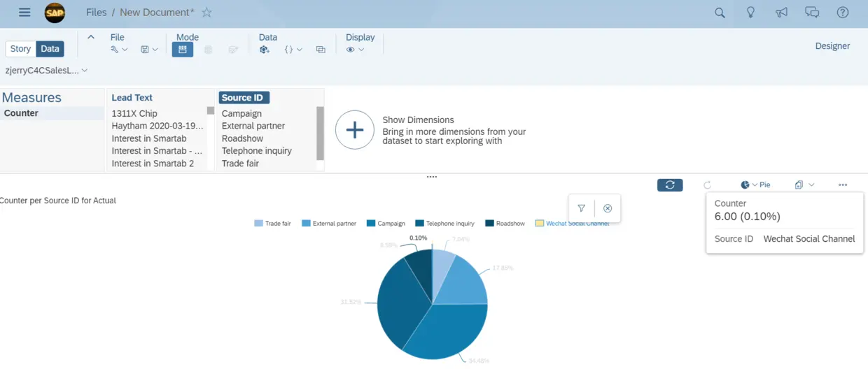 可以在SAP Analytics Cloud里切换不同的图表来显示这些Lead的来源分布情况: