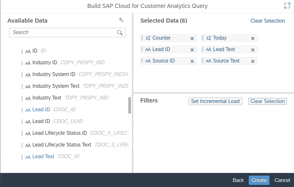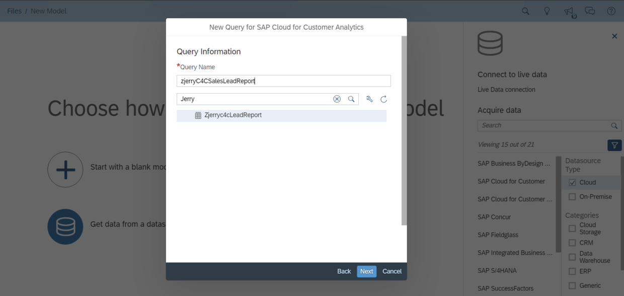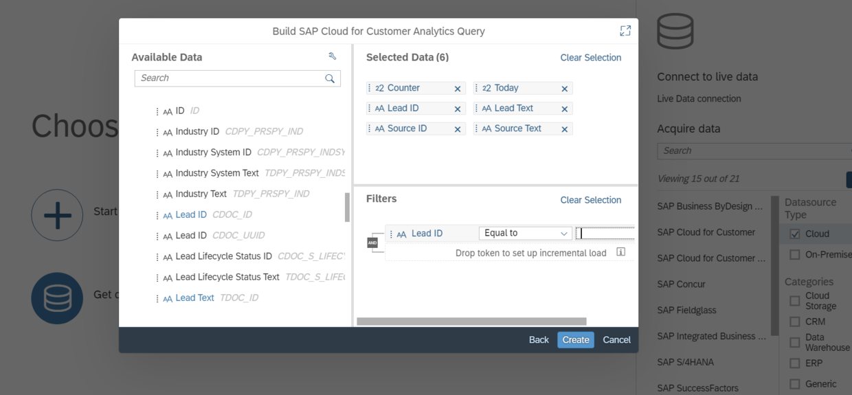 选择C4C report的characteristic作为SAP Analytics Cloud model的选择条件: