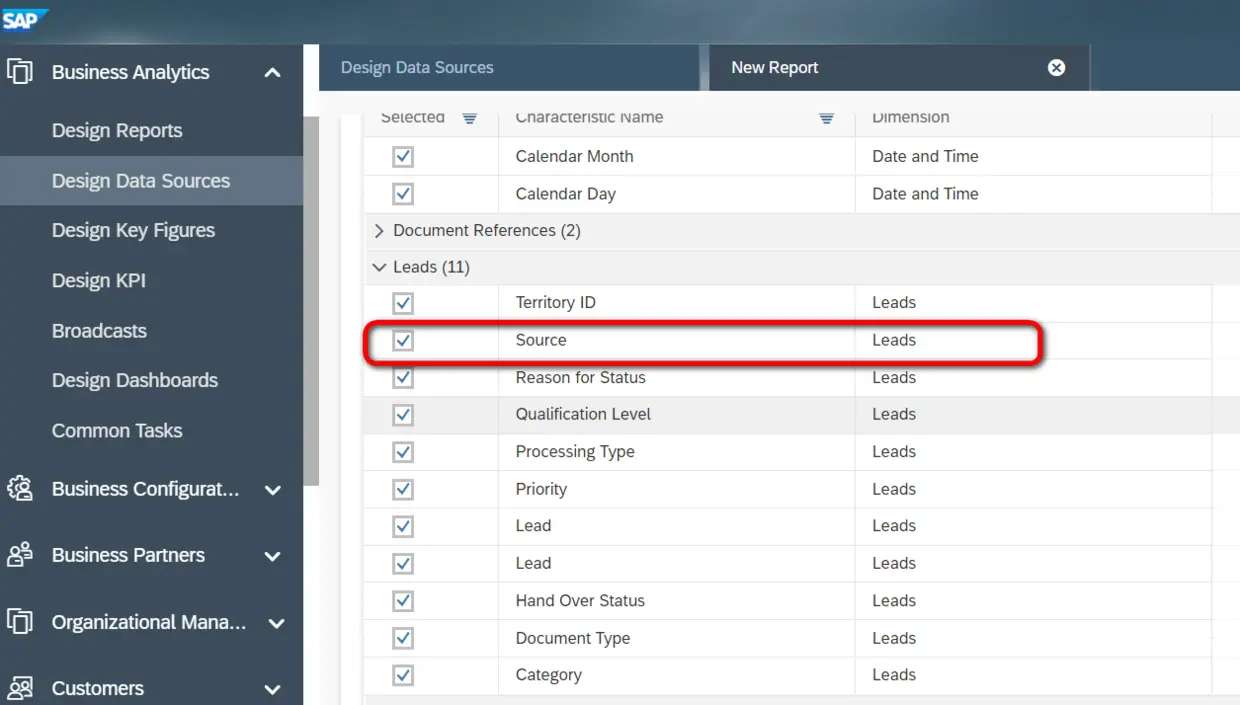 如何用Cloud for Customer business analytics的data source实现同样的需求? business analytics工作中心,打开Design Data Sources视图,选择Sales Lead这个data source: