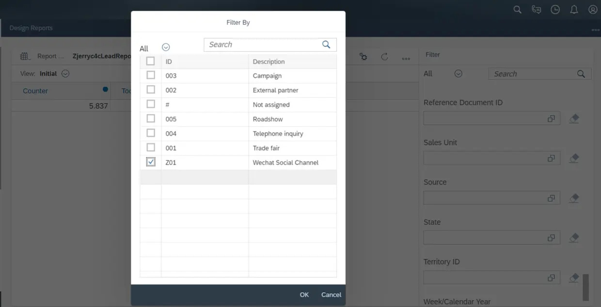 因为没有选择任何限制条件,所以显示系统里全部5837个Lead. 点击漏斗图标,打开Source字段的帮助对话框: