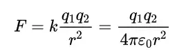 这就是我们中学学的库伦定律:两个电荷之间的静电力跟两个电荷量的乘积成正比,跟它们距离的平方成反比,剩下的都是常数。q1、q2就是两个电荷的电荷量,ε0是真空的介电常数(先不管它是啥意思,知道是个跟电相关的常数就行了),我们熟悉的球面积公式S=4πr²赫然出现在分母里,这是三维空间平方反比规律的代表。
