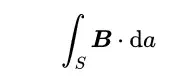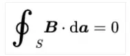 上图是一个很常见的磁铁周围的磁感线,磁铁外部的磁感线从N极指向S极,在磁铁的内部又从S极指向N极,这样就形成一个完整的闭环。如果磁感线都是一个闭环,没有独立存在的磁单极,那我们可以想一想:如果你在这个闭环里画一个闭合曲面,那么结果肯定就是有多少磁感线从曲面进去,就肯定有多少跟磁感线从曲面出来。因为如果有一根磁感线只进不出,那它就不可能是闭合的了,反之亦然。如果一个闭合曲面有多少根磁感线进,就有多少根磁感线出,这意味着什么呢?这就意味着你进去的磁通量跟出来的磁通量相等,那么最后这个闭合曲面包含的总磁通量就恒为0了。这就是麦克斯韦方程组的第二个方程——高斯磁场定律的核心思想:闭合曲面包含的磁通量恒为0。通过闭合曲面的磁通量(B·a是磁通量,套个曲面的积分符号就表示曲面的磁通量)我们上面已经说了,恒为0无非就是在等号的右边加个0,所以高斯磁场定律的数学表达式就是这样的: