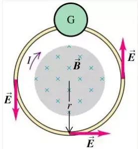 如果我们从上往下看的话,这个成闭环的感生电场就是如下图所示:它在这个闭环每点的方向都不一样,这样就刚好可以沿着回路驱动带电粒子,好像是电场在推着带电粒子在这里环里流动一样。