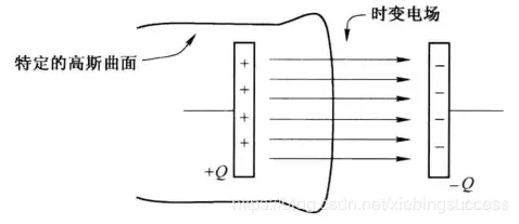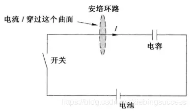 上图是一个包含电容器的简单电路。电容器顾名思义就是装电的容器,它可以容纳一定量的电荷。一开始电容器是空的,当我们把开关闭合的时候,电荷在电池的驱动下开始移动,移动到了电容器这里就走不动了(此路不通),然后电荷们就聚集在电容器里。因为电容器可以容纳一定量的电荷,所以,当电容器还没有被占满的时候,电荷是可以在电路里移动的,电荷的移动就表现为电流。所以,我们会发现当我们在给电容器充电的时候,电路上是有电流的,但是电容器之间却没有电流。所以,如果我们选择上图的曲面,那么明显是有电流穿过这个曲面,但是,如果我们选择下面这个曲面呢(此处图片来自《麦克斯韦方程直观》,需要的可以后台回复“麦克斯韦方程组”)?