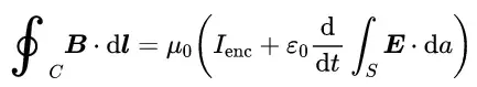 没错,电场强度越来越大,那么通过这个曲面的电通量也就越来越大。因此,我们可以看到虽然没有电流通过这个曲面,但是通过这个曲面的电通量却发生了改变。这样,我们就可以非常合理地把“变化的电通量”这一项也添加到产生磁场的原因里。因为这项工作是麦克斯韦完成的,所以添加了这一项之后的新公式就是麦克斯韦方程组的第四个方程——安培-麦克斯韦定律: