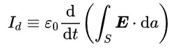 把它和安培环路定理对比一下,你就会发现它只是在在右边加了变化的电通量这一项,其它的都原封未动。E·a是电通量,套个面积分符号就表示通过曲面S的电通量,再加个d/dt就表示通过曲面S电通量变化的快慢。因为在讲法拉第定律的时候我们详细讲了通过曲面磁通量变化的快慢,这里只是把磁场换成了电场,其他都没变。ε0是真空中的介电常数,把这个常数和电通量变化的快慢乘起来就会得到一个跟电流的单位相同的量,它就被称为位移电流,如下图: