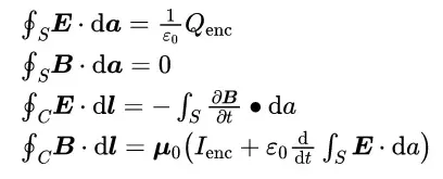 至此,麦克斯韦方程组的四个方程:描述静电的高斯电场定律、描述静磁的高斯磁场定律、描述磁生电的法拉第定律和描述电生磁的安培-麦克斯韦定律的积分形式就都说完了。把它们都写下来就是这样: