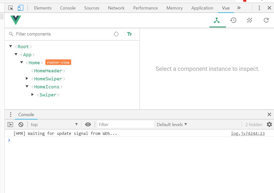 好了,现在在命令行或者gitbash中启动你的vue项目,打开chrome浏览器就能在调试面板中看到vue插件了,如图: