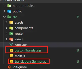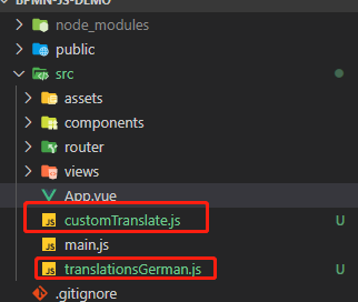 对于这个汉化文件我是在码云上找到了一位大佬翻译好的文件,链接 里面有两个文件 translationsGerman.js 和 customTranslate.js,其中 translationsGerman.js这个文件是翻译好的文本配置,customTranslate.js 的话就是汉化器了,它会按照获取到编辑器原本的配置对比 translationsGerman.js 中的配置然后进行替换操作,将相关英文替换为中文文本。
