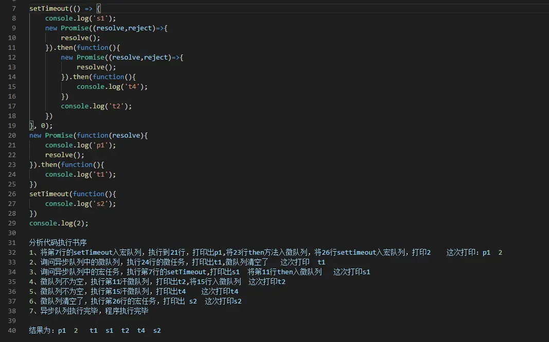 // 1、将第7行的setTimeout入宏队列,执行到21行,打印出p1,将23行then方法入微队列,将26行settimeout入宏队列,打印2 这次打印:p1 2
